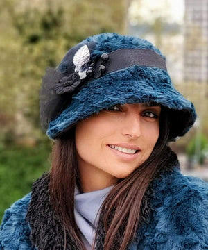 THE ABIGAIL - Handmade in Seattle, WA, USA. This 1920s style hat is shown in Luxury Faux Fur in Peacock Pond with a Black Faux Suede under-brim and assorted bands and trims.This is a whimsical, asymmetrical hat style with a flexible brim that can be flipped up or down. Available in solid or two-tone styles. Brim is 2" at center front curving into 3-1/2" at the asymmetrical point and 1-1/2" at center back of hat. Side crown height is 3-1/2". Crown circumference measures 7-1/2".Prices are as shown. These pieces are made-to-order and may be exchanged or returned for a store credit only. All sales of items with customizations or alterations are final.