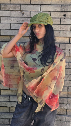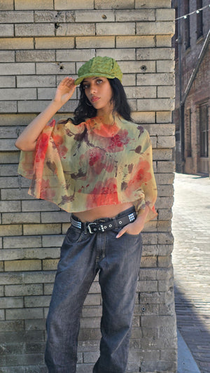 THE COASTAL GARDEN PONCHO - Handmade in Seattle, WA, USA. Shown inSun Star, ayelloworganza with vibrant splashes of orange flowers with moss green leaves, this poncho is available in a wide selection of colors. These ponchos are absolutely stunning and are available in a variety of styles. The Coastal Garden Poncho is great for transitioning from day to night whether you want aponcho,tunic, or a simple scarf look. The crinkled texture of this fabric makes it perfect to travel with. Laid flat, this poncho measures 39" x 55". A neck opening measuring approximately 13" is set along the middle seem, with a 10" opening at either end of the poncho. Hanging as a boat-neck poncho, the center front measures 19" down, while the sides hang 33" down.