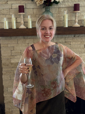 THE COASTAL GARDEN PONCHO - Handmade in Seattle, WA, USA. Shown in Bayberry, a blush/salmon organza with lavender and rust flowers with moss green leaves, this poncho is available in a wide selection of colors. These ponchos are absolutely stunning and are available in a variety of styles. The Coastal Garden Poncho is great for transitioning from day to night whether you want a poncho,tunic, or a simple scarf look. The crinkled texture of this fabric makes it perfect to travel with. Laid flat, this poncho measures 39" x 55". A neck opening measuring approximately 13" is set along the middle seem, with a 10" opening at either end of the poncho. Hanging as a boat-neck poncho, the center front measures 19" down, while the sides hang 33" down.