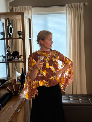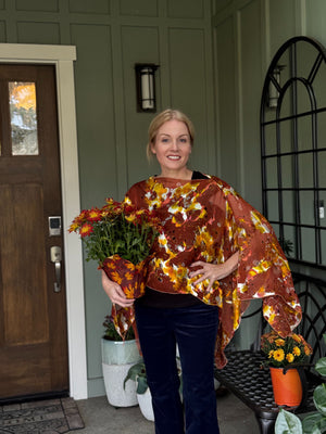 THE GARDEN PATH PONCHO - Handmade in Seattle, WA, USA. Shown in Snap Dragon, a Orange/Gold, hand-painted, silk-chiffon with vibrant swirls of color, this poncho is available in a wide selection of colors. Burnout satin highlights begin to glow as the fabric shifts in the light. These ponchos are absolutely stunning and drape gracefully in a variety of styles. The Garden Path Poncho is great for transitioning from day to night whether you want a poncho, top, tunic, or a simple scarf look. Laid flat, this poncho measures 39" x 55". A neck opening measuring approximately 13" is set along the middle seem, with a 10" opening at either end of the poncho. Hanging as a boat-neck poncho, the center front measures 19" down, while the sides hang 33" down.