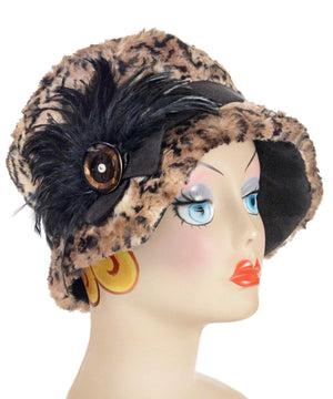 THE ABIGAIL - Handmade in Seattle, WA, USA. This 1920s style hat is shown in Luxury Faux Fur in Carpathian Lynx with a Black Faux Suede under-brim and a 1-3/4" Black Faux Suede band.This is a whimsical, asymmetrical hat style with a flexible brim that can be flipped up or down. Available in solid or two-tone styles. Brim is 2" at center front curving into 3-1/2" at the asymmetrical point and 1-1/2" at center back of hat. Side crown height is 3-1/2". Crown circumference measures 7-1/2". Shown with a Black Faux Suede band (84L-598), a black feather fan (71) and a black/gold, capiz shell button (B16-SHELL-BLK).Prices are as shown. These pieces are made-to-order and may be exchanged or returned for a store credit only. All sales of items with customizations or alterations are final.