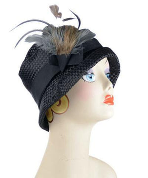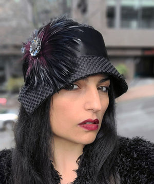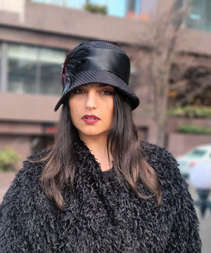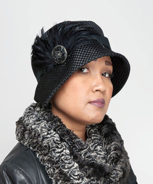 THE ABIGAIL - Handmade in Seattle, WA, USA. This 1920s stylehat is shown in Interconnected in Black Upholstery Fabric with a 1 1/2" black grosgrain band.This is a whimsical, asymmetrical hat style with a flexible brim that can be flipped up or down. Available in solid or two-tone styles. Brim is 2" at center front curving into 3-1/2" at the asymmetrical point and 1-1/2" at center back of hat. Side crown height is 3-1/2". Crown circumference measures 7-1/2". Shown with assorted trims.Prices are as shown. These pieces are made-to-order and may be exchanged or returned for a store credit only. All sales of items with customizations or alterations are final.