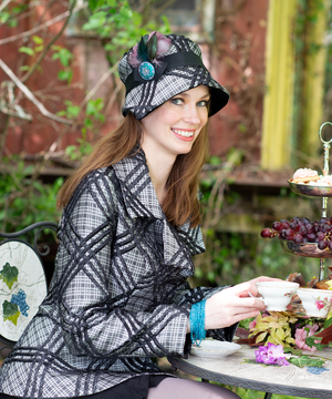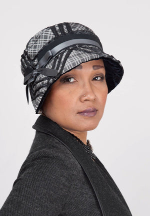 THE ABIGAIL - Handmade in Seattle, WA, USA. This 1920s style hat is shown in Silver Plaid Upholstery Fabric with a Black Velvet under-brim and a 1-1/2" black grosgrain band.This is a whimsical, asymmetrical hat style with a flexible brim that can be flipped up or down. Available in solid or two-tone styles. Brim is 2" at center front curving into 3-1/2" at the asymmetrical point and 1-1/2" at center back of hat. Side crown height is 3-1/2". Crown circumference measures 7-1/2". Shown with assorted trims. Prices are as shown. These pieces are made-to-order and may be exchanged or returned for a store credit only. All sales of items with customizations or alterations are final.
